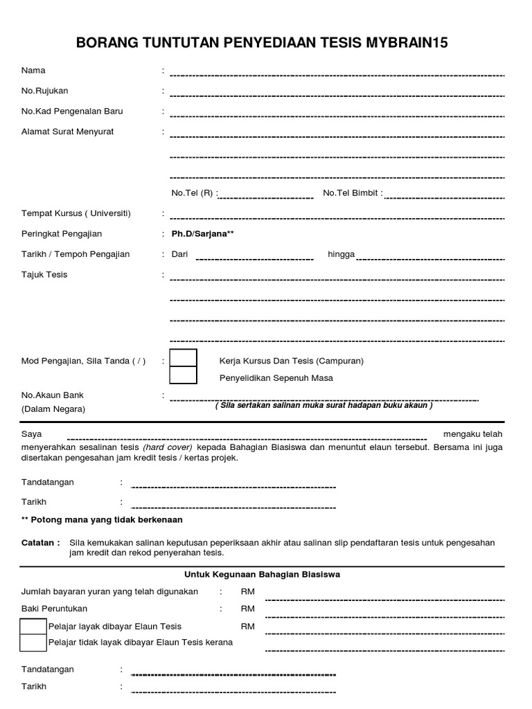 Tempat Kursus Universiti. Borang Tuntutan Elaun Thesis Mybrain - If you are looking for professional expert writers then our service is worth checking out. Berikut dikongsikan maklumat lanjut permohonan biasiswa MyBrain Sc 2021 untuk makluman anda.
